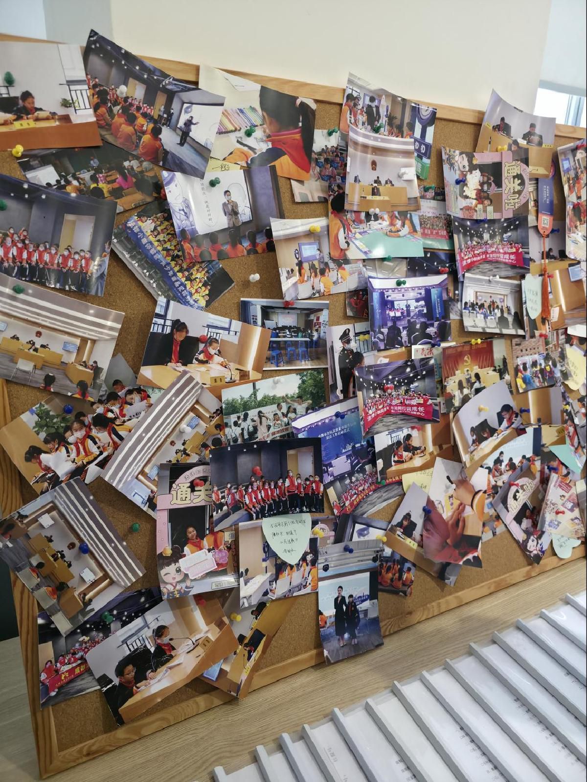 成都市金牛区青少年普法教育基地内,模拟法庭内张贴的活动照片。中国网信网 陈舞阳 摄