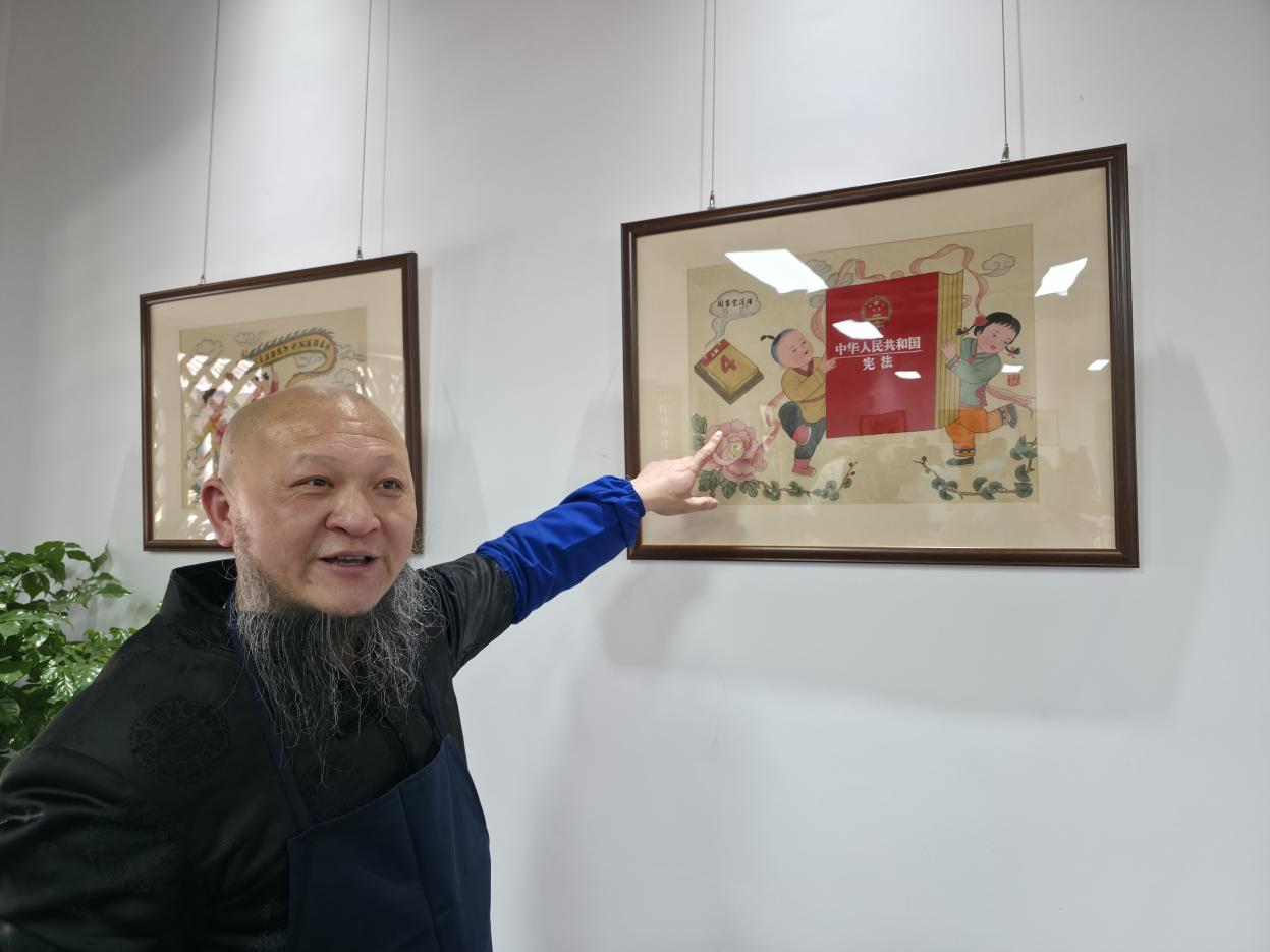 乐山市夹江县年画馆内,非遗传承人张荣强向记者介绍宪法主题年画寓意。中国网信网 陈舞阳 摄