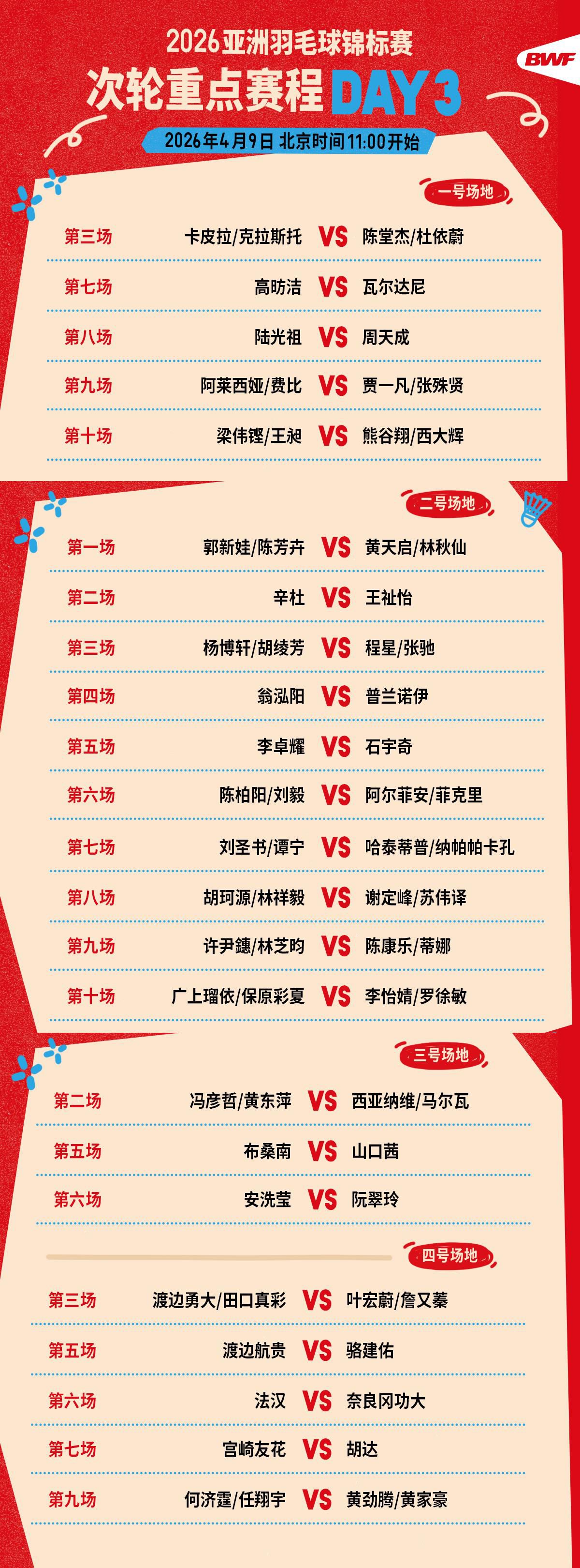 2026年亚洲羽毛球锦标赛今天(9日)迎来第三个比赛日,将于北京时间中午11时开赛。