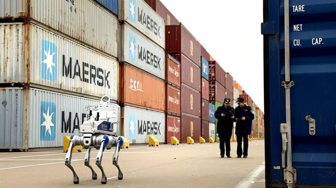 四足机器人在码头查验进境空箱。洪韵 摄
