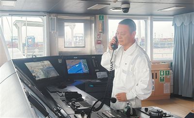 王挺在驾驶室指挥船舶靠泊。陈盛斌摄