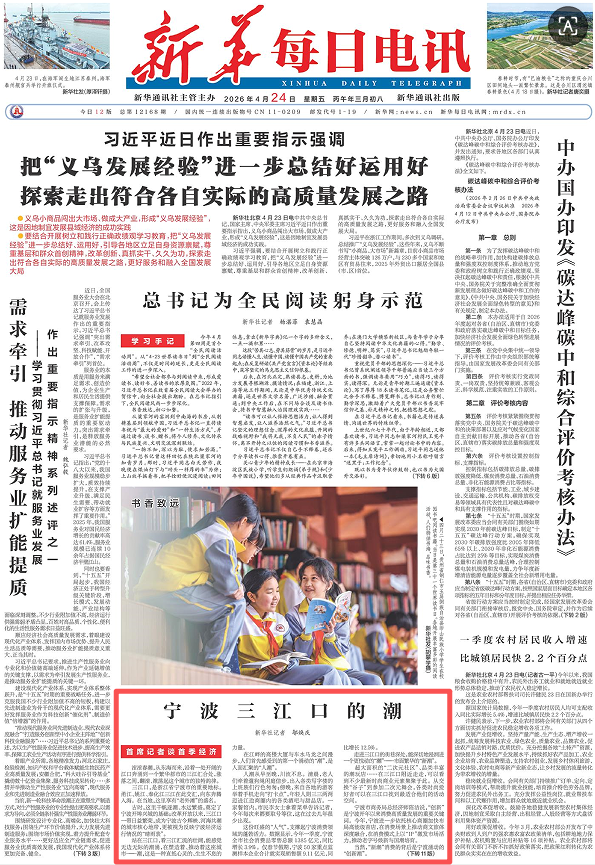 4月24日,《新华每日电讯》头版刊发文章《宁波三江口的潮》,从川流不息的“人潮”、市面繁华的“新潮”到背后涌动的“创新潮”和起到支撑的“开放潮”……报道了宁波以三江之潮为脉搏,以创新为桨、以开放为帆,在高质量发展航道上向着更广阔的未来破浪前行。春日潮声,将继续见证宁波以及整个之江大地的每一次成长、每一次突破,书写属于这座城市、这片热土的光荣。