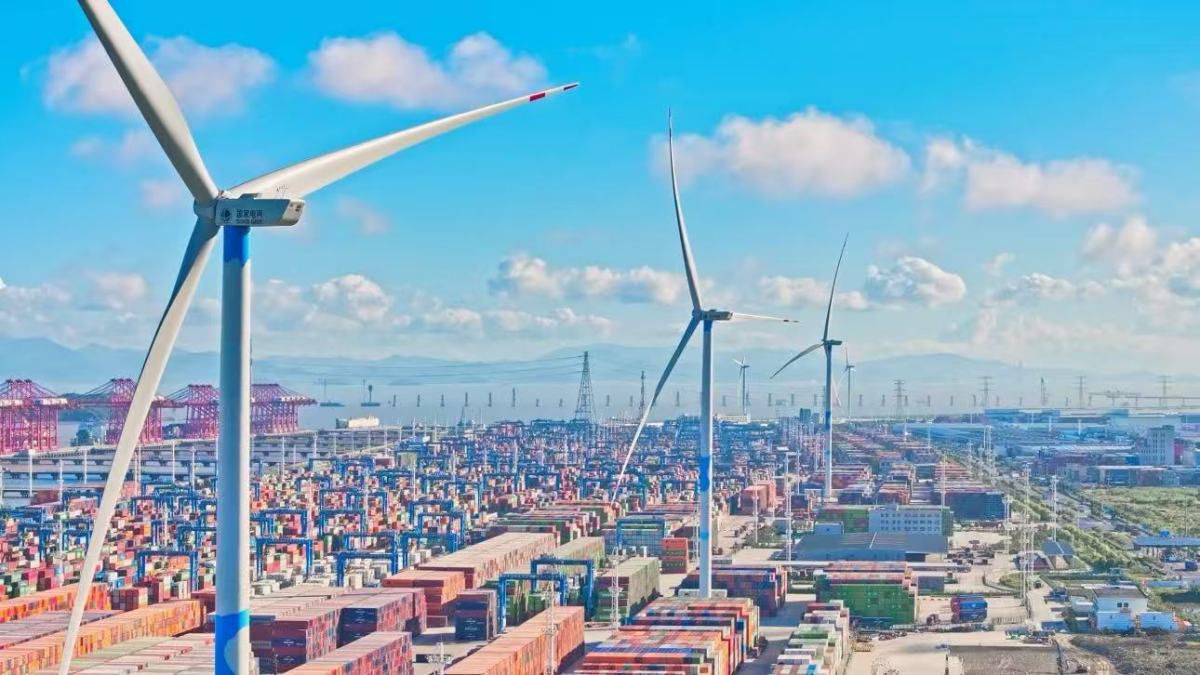 走进梅山港区,5台兆瓦级风力发电机迎风轮转,与屋顶光伏板相映成景。“风光储岸”一体化能源系统让港区绿电自给率突破60%,年减少碳排放超1万吨——这是全省首个“绿电码头”。