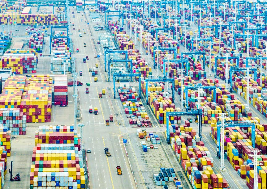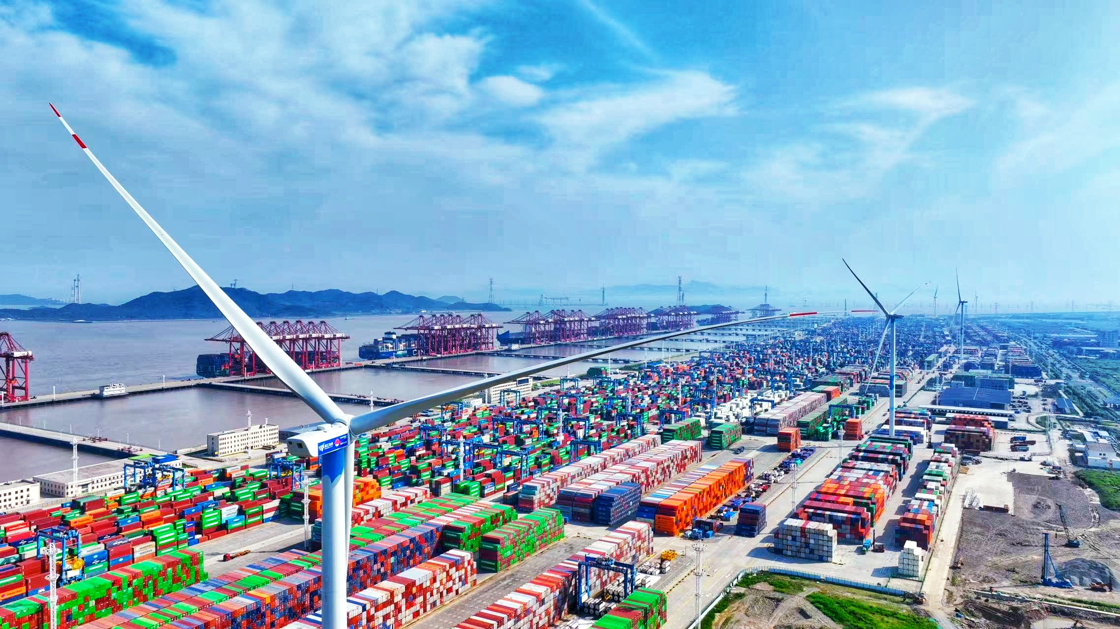 春日的宁波舟山港梅山港区一派繁忙景象,远控桥吊与无人集卡默契配合,完成一次次装箱作业,确保浙江制造、中国制造安全,有序装上远洋巨轮,准时送达世界各地。不远处,白色风车徐徐转动,将海风转化为电能,源源不断地注入港区各个角落。