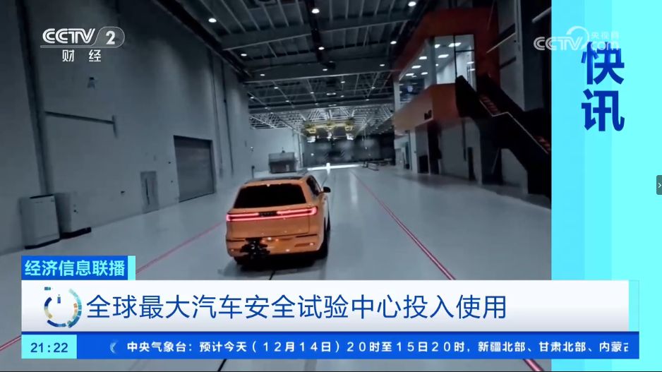 12月14日,央视《朝闻天下》《今日环球》《新闻直播间》《中国新闻》《经济信息联播》栏目播出《全球最大汽车安全试验中心投入使用》,报道了日前,全球最大的汽车安全试验中心在宁波投入使用。这一中心涵盖了多项吉尼斯认证的世界纪录,不仅在全球汽车试验验证领域占地面积最大,同时也拥有最全的测试功能。